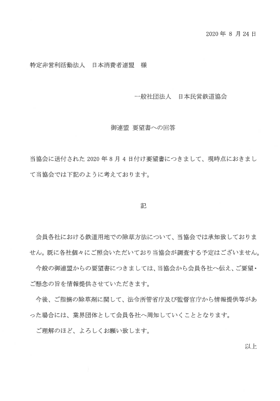 【回答】鉄道敷地内における除草に関する要望書への回答(2020年8月28日)