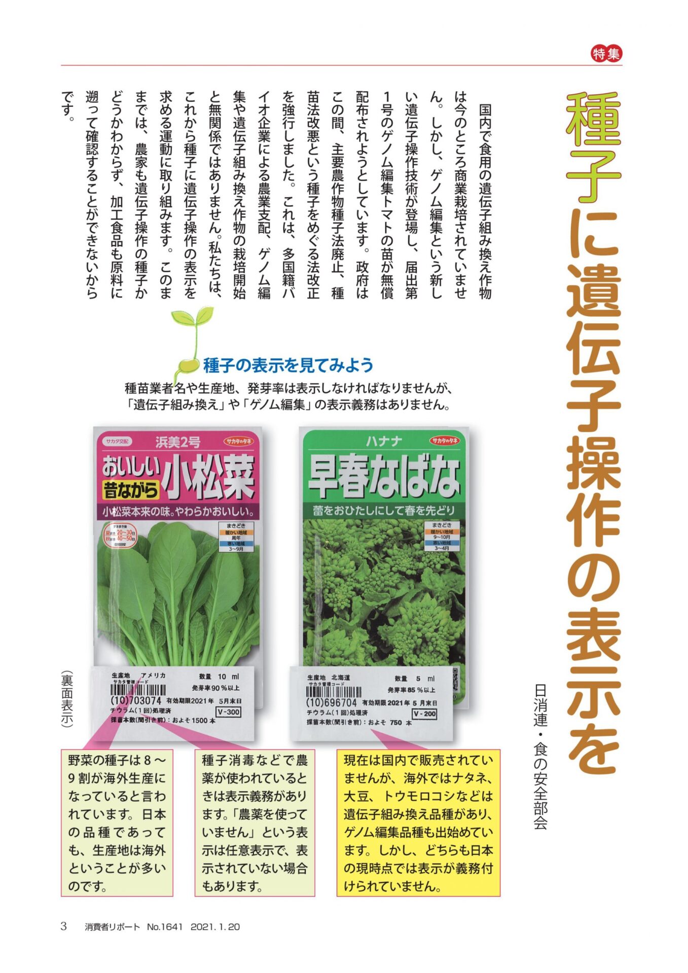 国内で食用の遺伝子組み換え作物 は今のところ商業栽培されていませ ん。しかし、ゲノム編集という新し い遺伝子操作技術が登場し、届出第 1号のゲノム編集トマトの苗が無償 配布されようとしています。政府は この間、主要農作物種子法廃止、種 苗法改悪という種子をめぐる法改正 を強行しました。これは、多国籍バ イオ企業による農業支配、ゲノム編 集や遺伝子組み換え作物の栽培開始 と無関係ではありません。私たちは、 これから種子に遺伝子操作の表示を 求める運動に取り組みます。このま までは、農家も遺伝子操作の種子か どうかわからず、加工食品も原料に 遡って確認することができないから です。