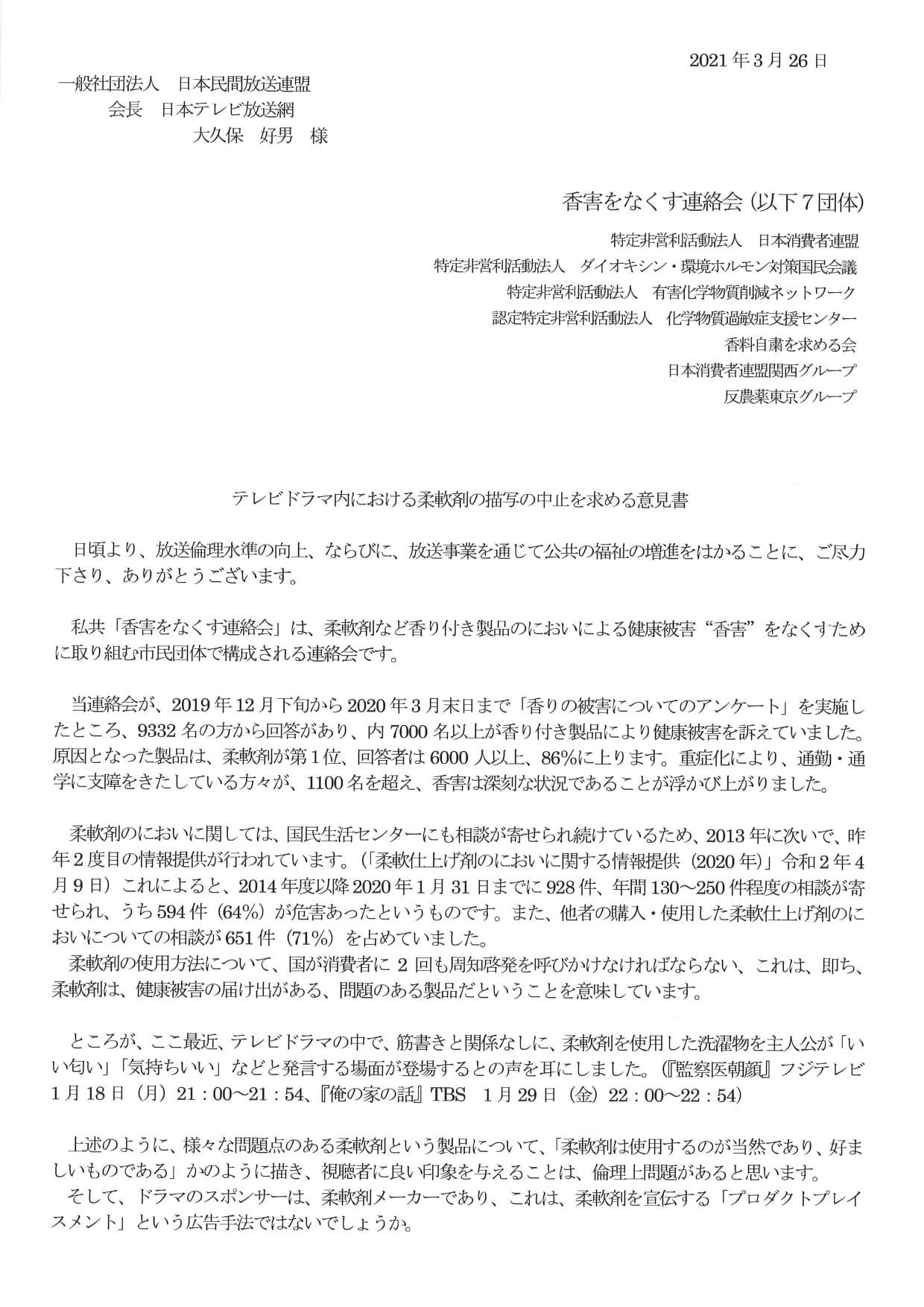 日本消費者連盟が事務局を務める「香害をなくす連絡会」は、3月26日に、一般社団法人日本民間放送連盟に対し、テレビドラマ内における柔軟剤の描写の中止を求める意見書を提出しました。