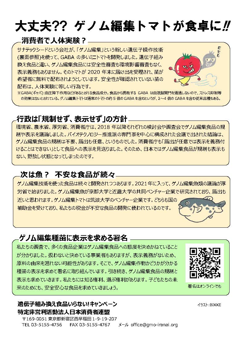 そこで、日本消費者連盟と遺伝子組み換え食品いらない!キャンペーンは、ゲノム編集食品の現状とその問題点をまとめたチラシをつくりました。ぜひご利用ください。