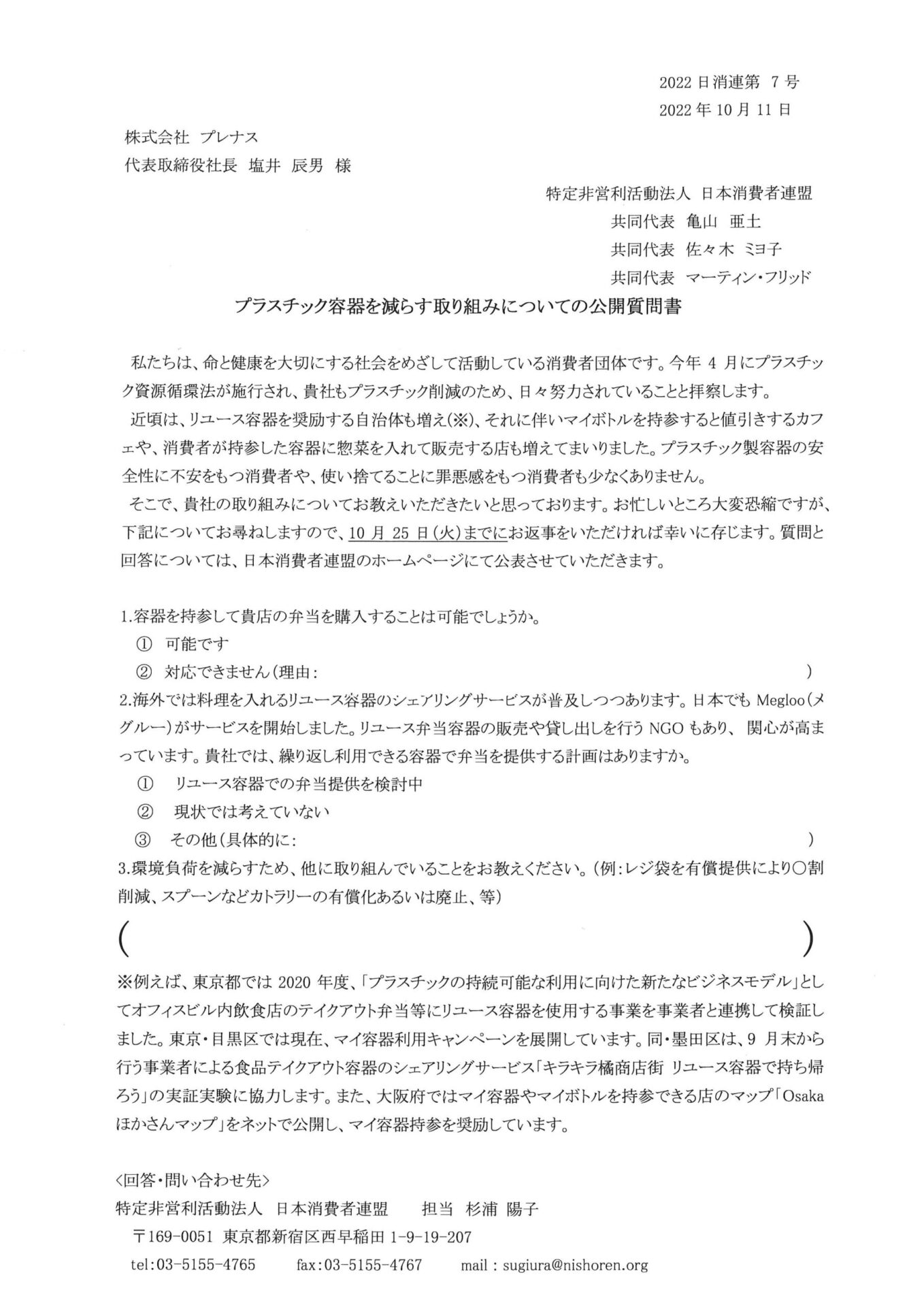 日消連は10月11日、総菜・弁当チェーン5社にプラスチック容器を減らす取り組みについての公開質問書を送りました。